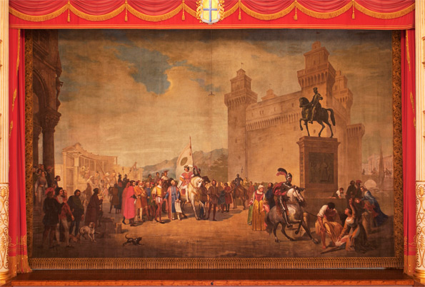 Tra le figure, tutte caratterizzate da nitidi tratti individuali, spicca quella dell’armigero a cavallo che avanza intimando ad alcuni popolani di spostarsi, episodio nel quale si è voluta leggere una velata allusione da parte dell’artista alla prepotenza delle milizie ducali del suo tempo. Al momento della sua presentazione il sipario dipinto da Adeodato Malatesta, raro esempio di quella pittura di storia che aveva reso celebre Hayez nel più vivace contesto culturale milanese, riportò un notevole successo di critica, e non soltanto a livello locale. Ne parlarono con ammirazione fogli come la “Gazzetta privilegiata” di Milano, il “Mondo illustrato” di Torino e il “Tiberino” di Roma, equiparandolo a un “magico quadro ad olio”; anche il pittore Domenico Morelli, passando diversi anni dopo per Modena, si sarebbe stupito di fronte all’opera per la sua modernità. I numerosi sipari dipinti nel corso dell’Ottocento presentano in effetti quasi tutti soggetti di ispirazione classica o mitologica; la scelta tematica del pittore modenese dovette perciò apparire per molti aspetti coraggiosa e innovativa.